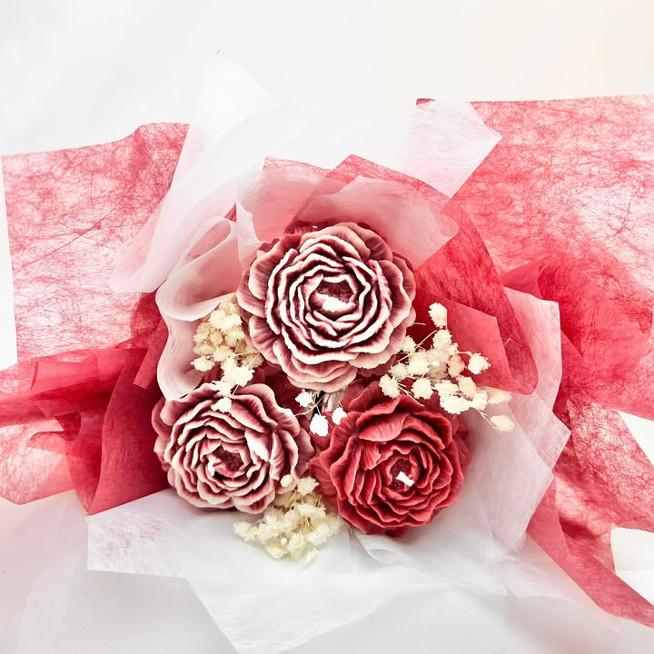 Bó hoa 3 bông mẫu đơn rực rỡ làm từ sáp đậu nành, sáp ong và tinh dầu thiên nhiên sẽ là lựa chọn mới lạ, tinh tế, tượng trưng cho tình yêu nồng cháy và sự trân trọng sâu sắc.