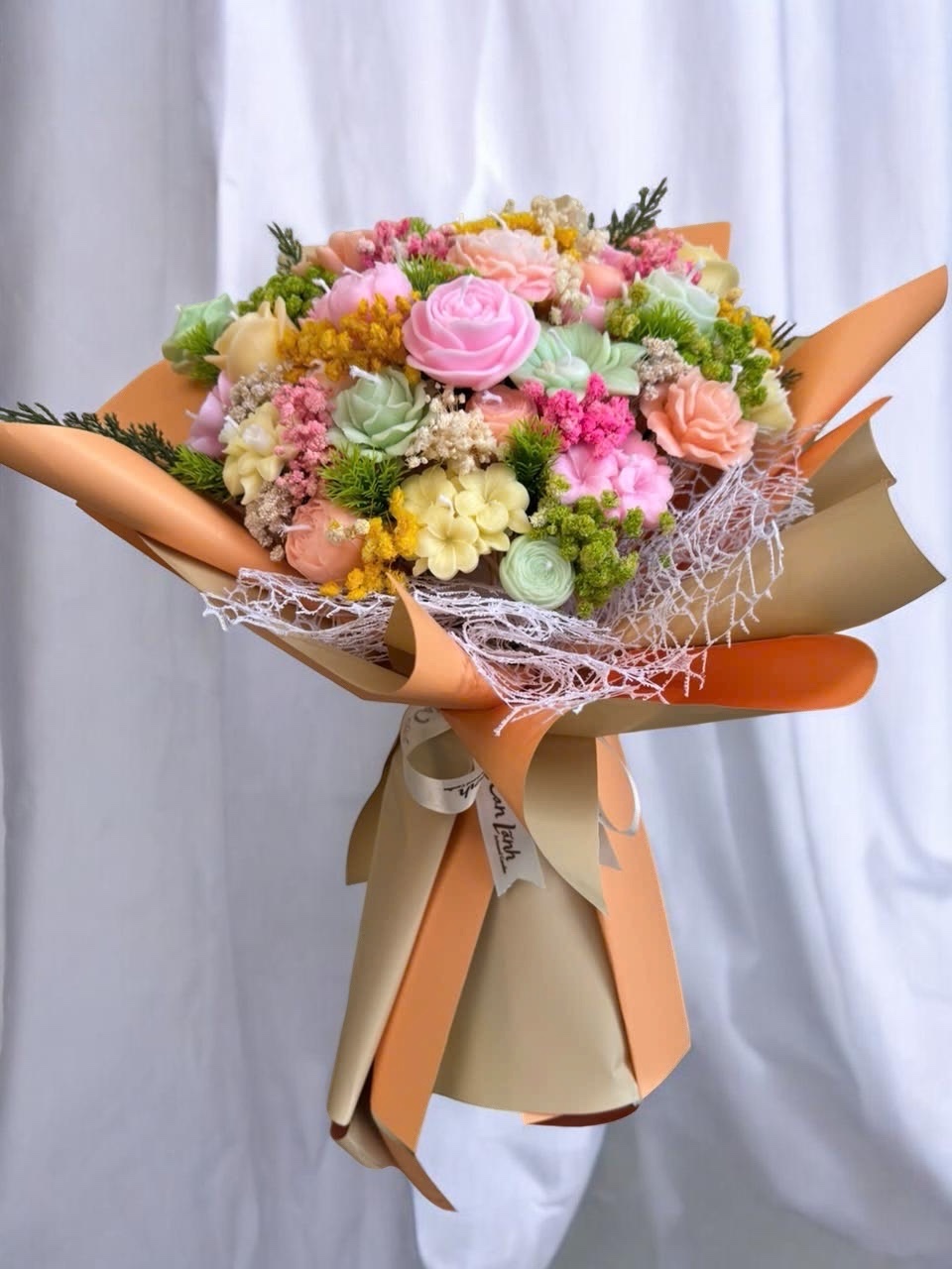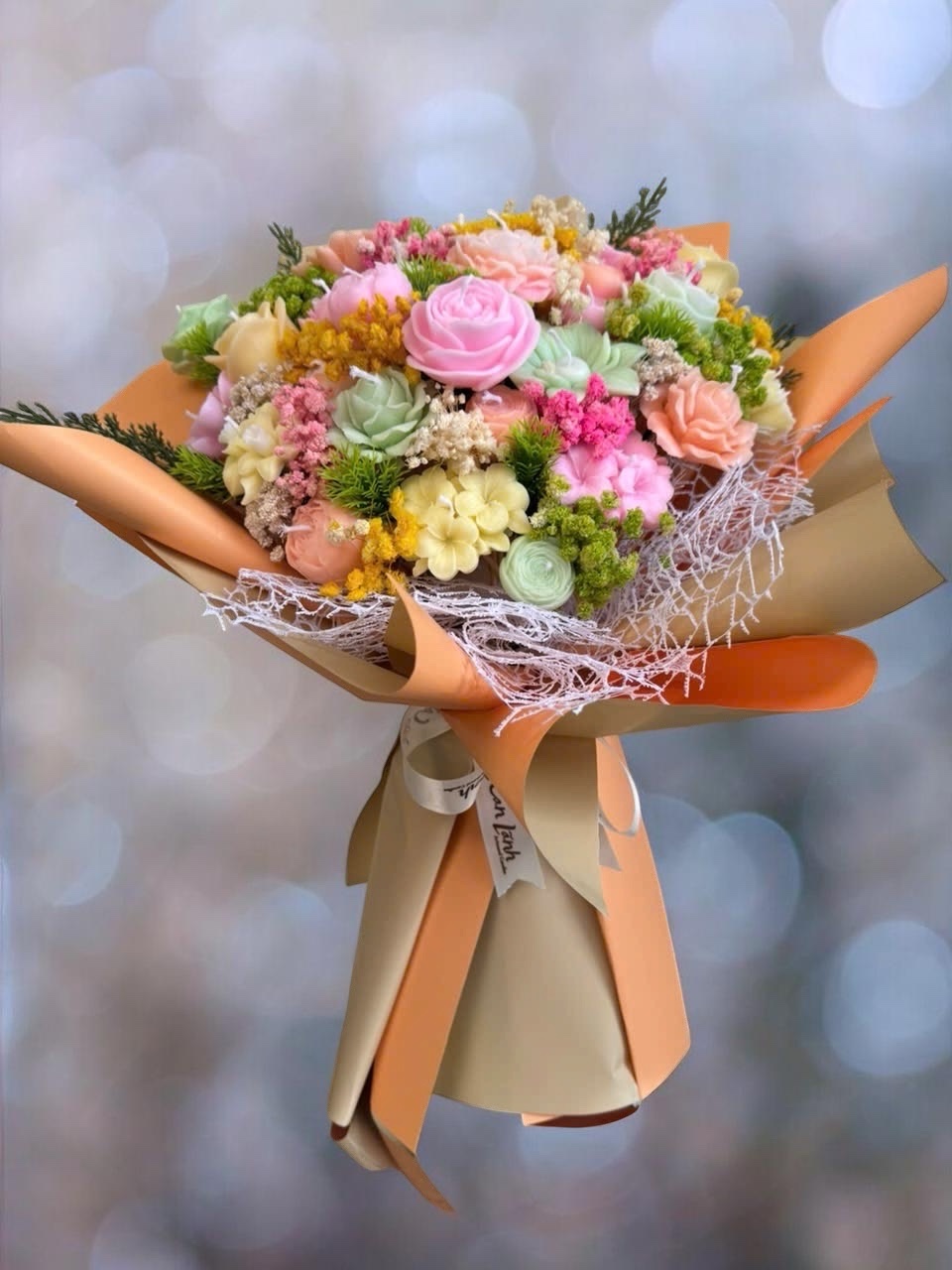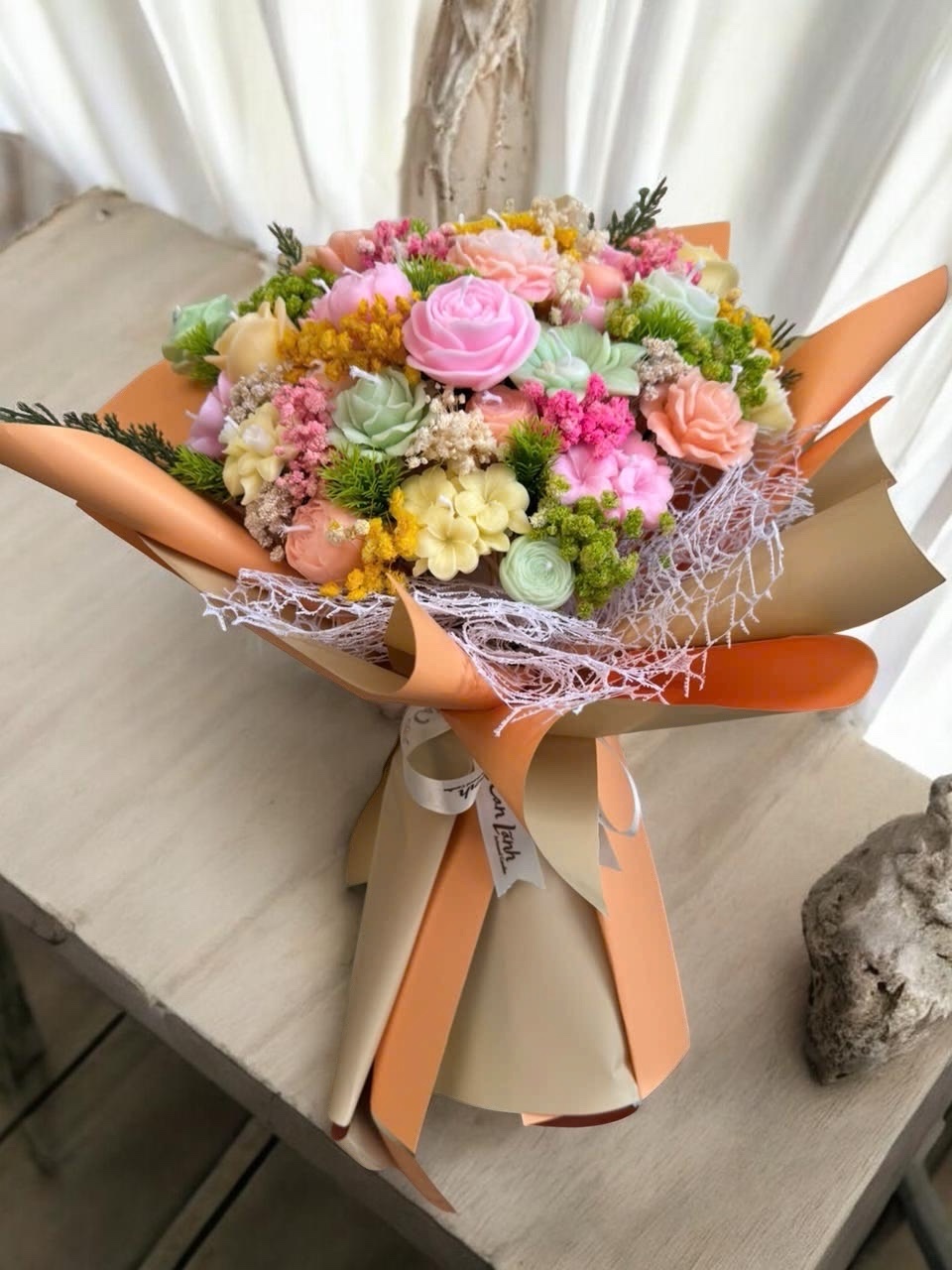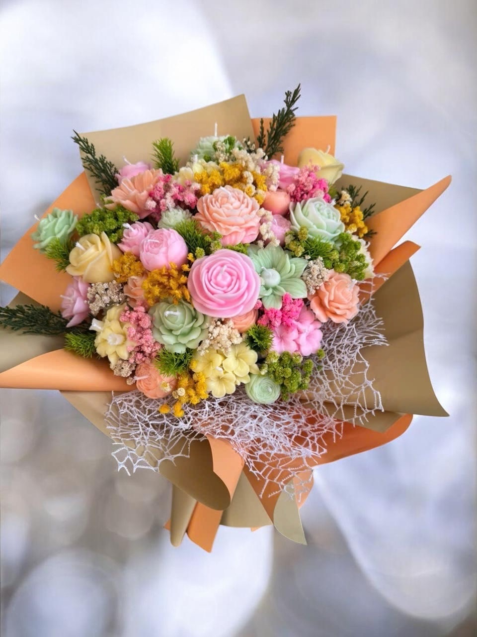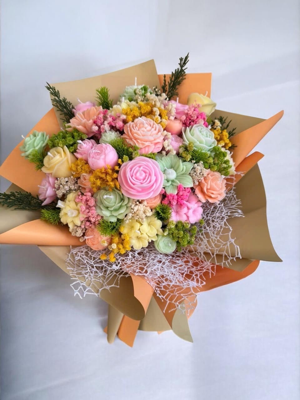 Bó hoa nến thơm 30 bông từ Can Lãnh Artisanal Candles là một tác phẩm nghệ thuật đỉnh cao, kết hợp giữa kỹ thuật đổ khuôn nến tinh xảo và nghệ thuật bó hoa hiện đại. Với tông màu cam đào, hồng phấn và xanh mint đan xen, bó hoa toát lên vẻ đẹp rực rỡ nhưng vẫn vô cùng thanh nhã, là món quà thay lời chúc về một tương lai tươi sáng và hạnh phúc.