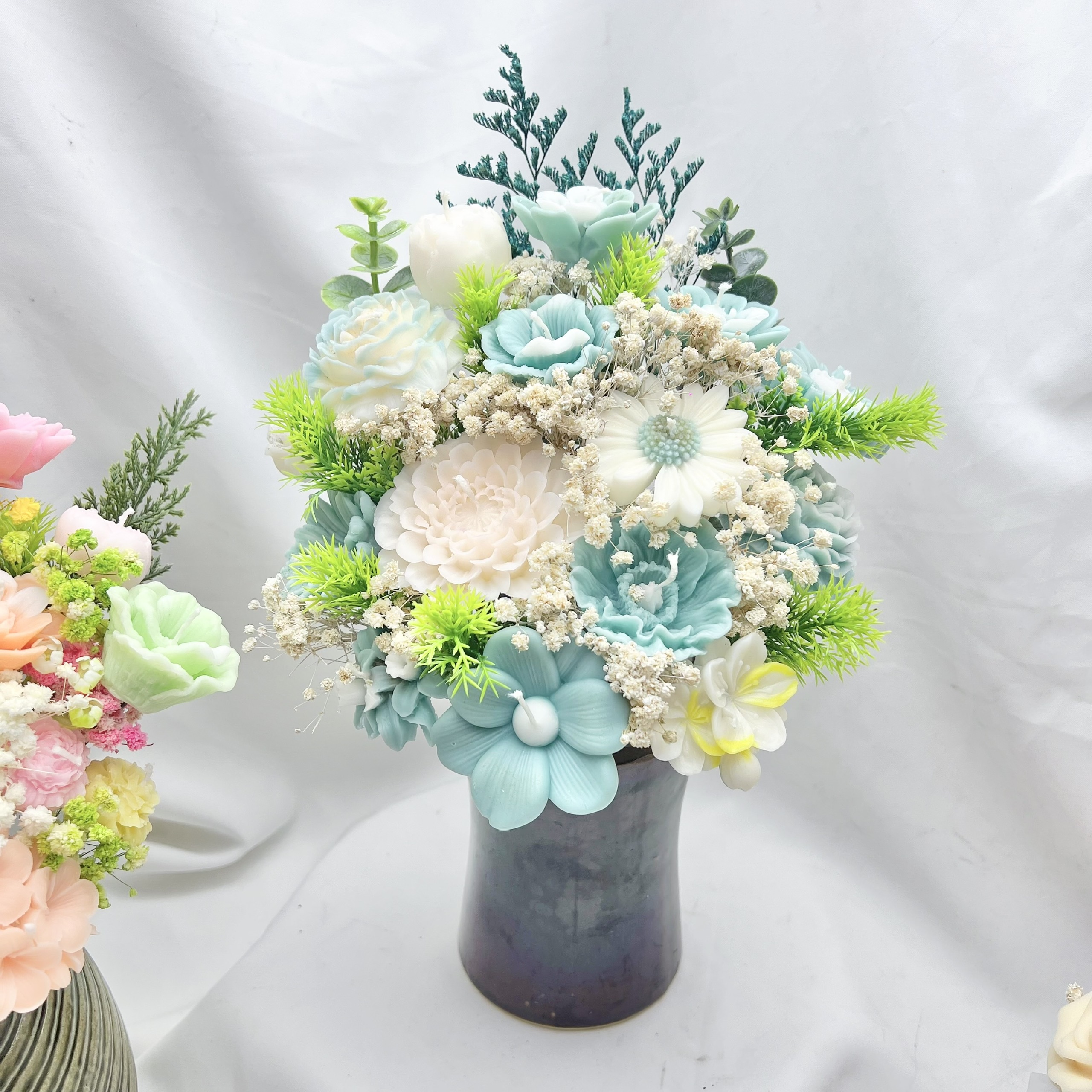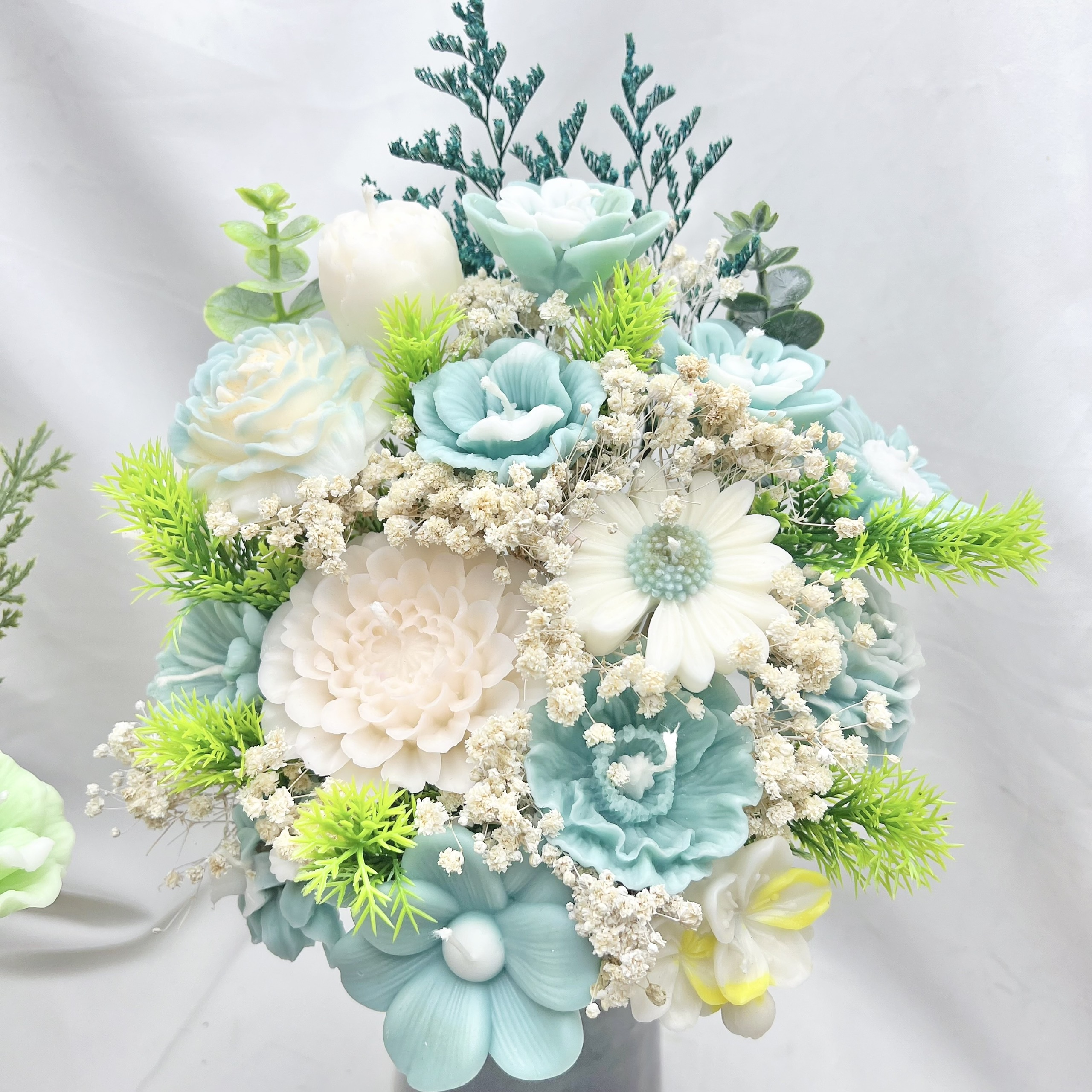Chế tác thủ công tỉ mỉ: 15 bông hoa nến bao gồm hoa cúc, hoa trà và các loài hoa cỏ được đúc tay 100%, sống động như hoa tươi đang kỳ nở rộ.