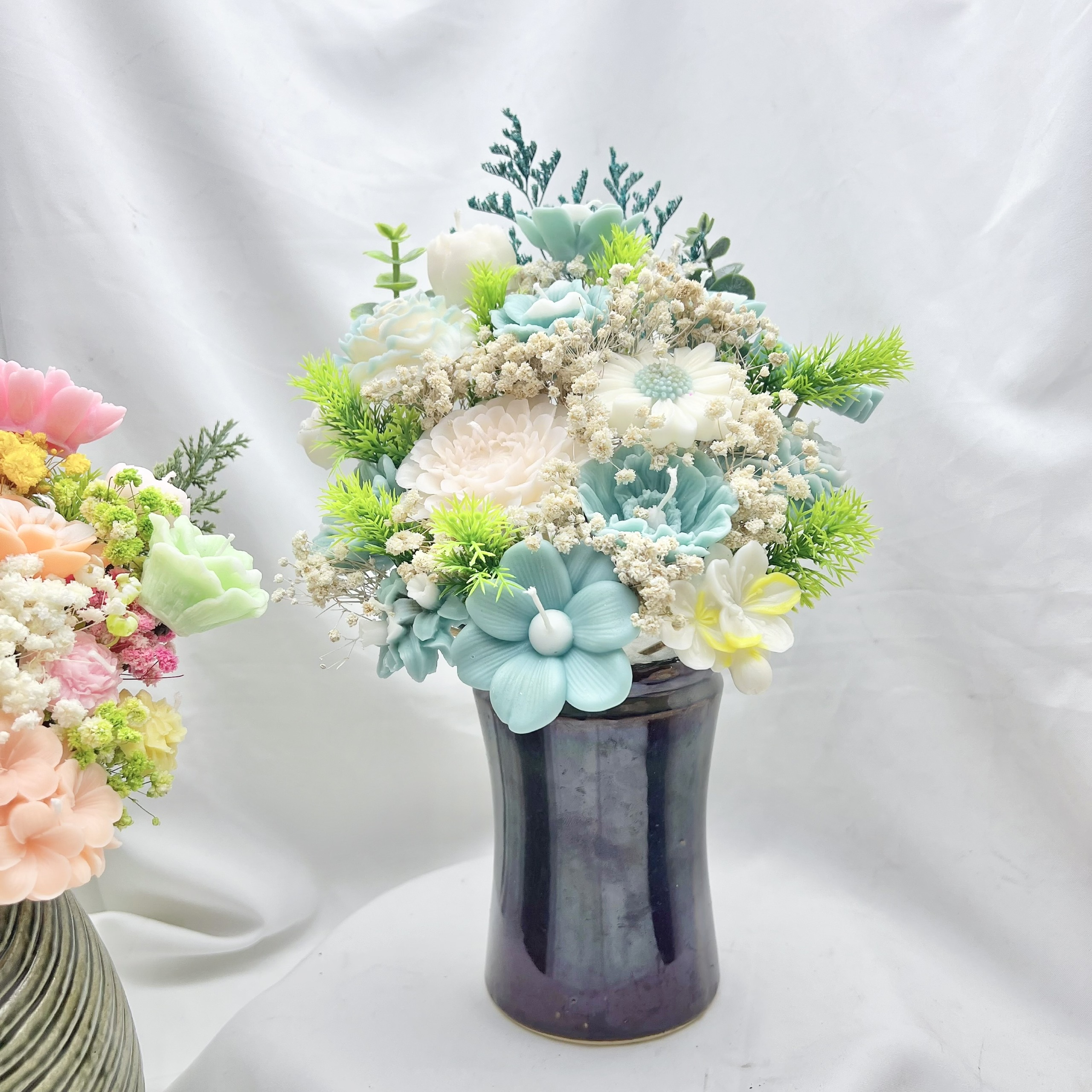 Phong cách Vintage sang trọng: Bình gốm tối màu làm nền hoàn hảo cho các đóa hoa nến màu xanh Mint, trắng kem và vàng nhạt, tạo điểm nhấn nghệ thuật đặc sắc cho phòng khách hoặc thư phòng.