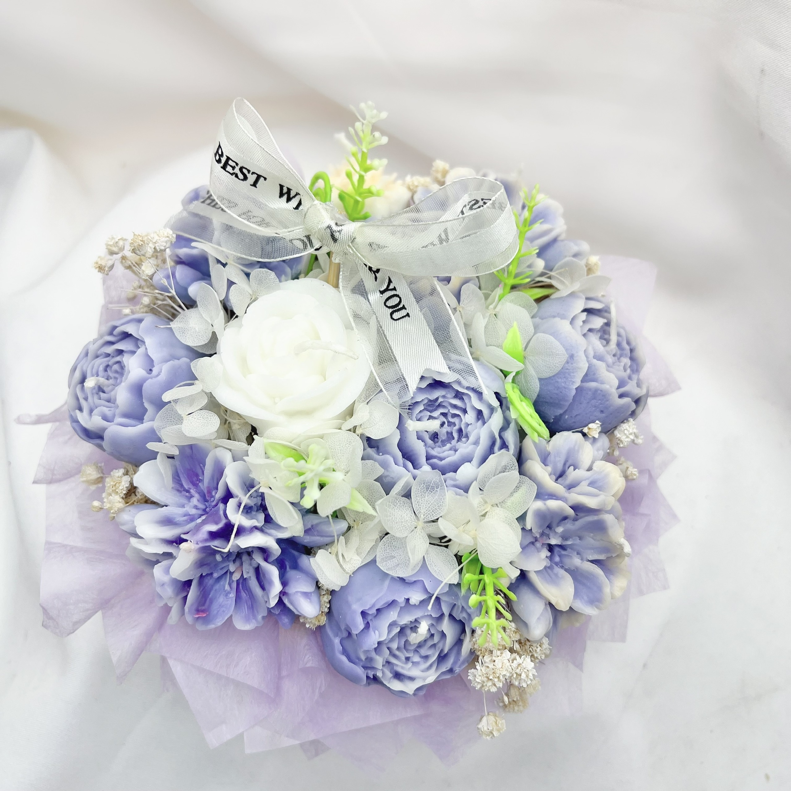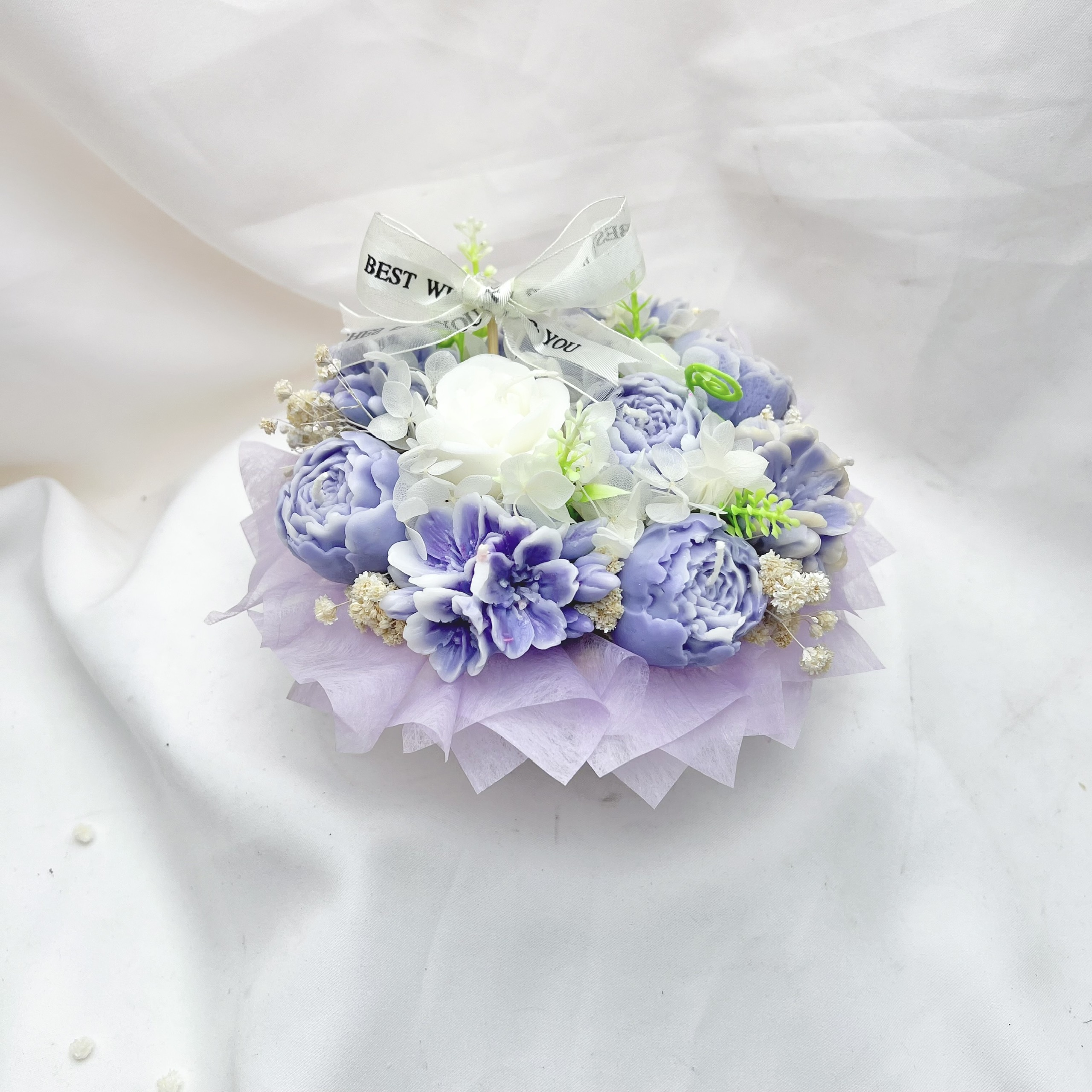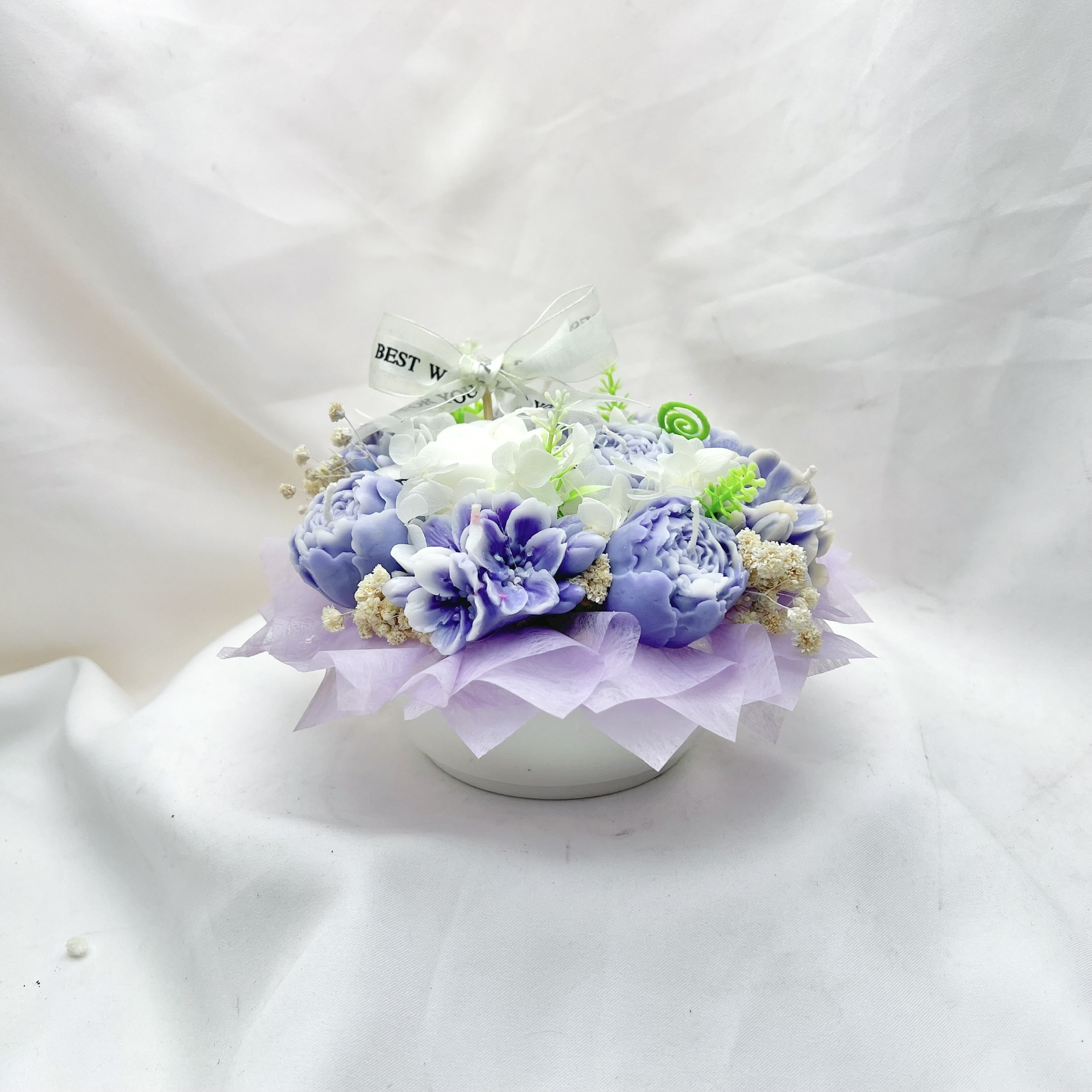 Sắc tím lãng mạn: 11 đóa hoa nến được tạo hình thủ công với các tone màu từ tím lavender dịu nhẹ đến tím violet sâu thẳm, điểm xuyết đóa hoa trắng tinh khôi ở trung tâm tạo nên điểm nhấn cân bằng và trang nhã.