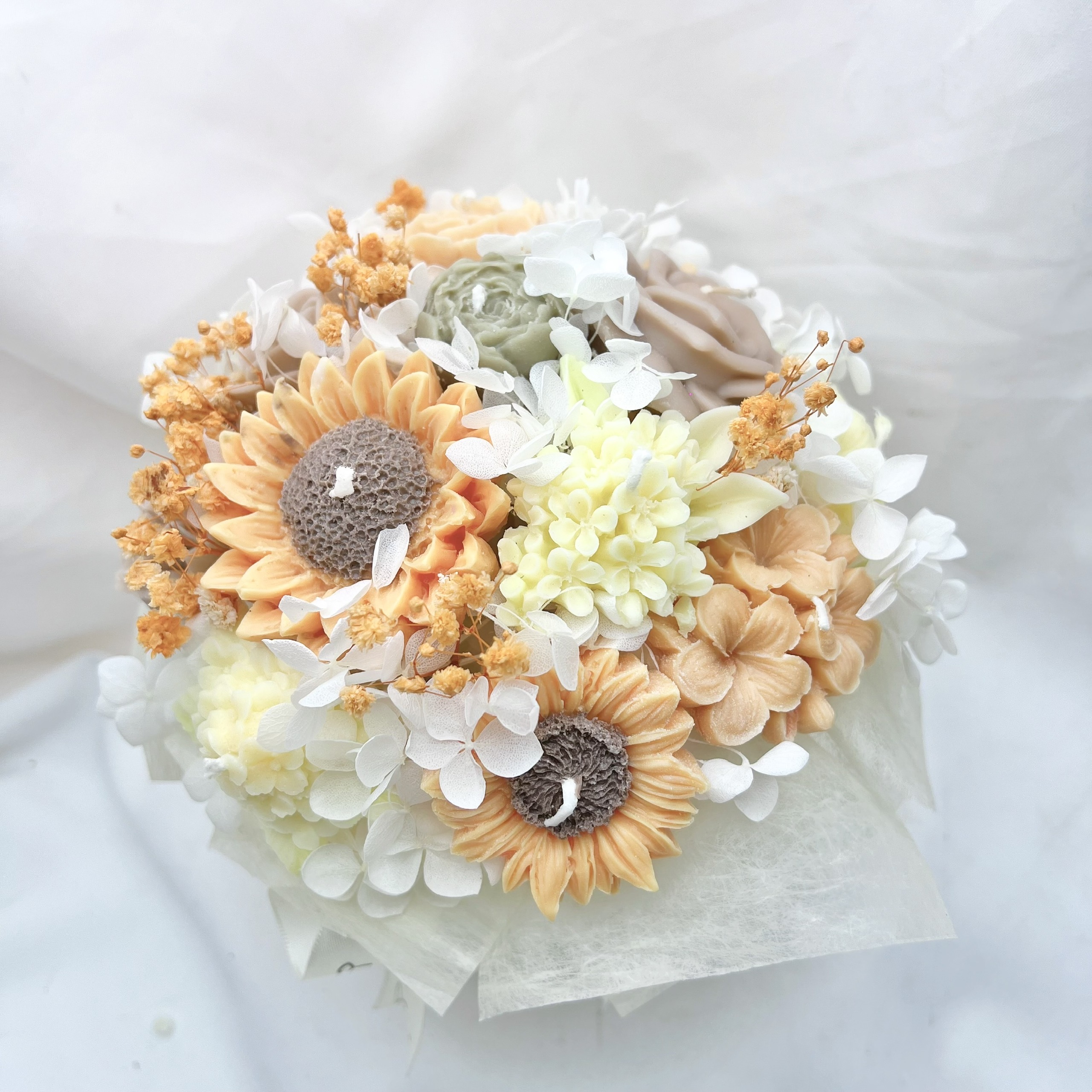 Năng lượng của niềm hy vọng: Tâm điểm của tác phẩm là những đóa Hướng Dương nến được đổ khuôn thủ công với sắc cam vàng rực rỡ, mang ý nghĩa về sự kiên định và một khởi đầu đầy may mắn.