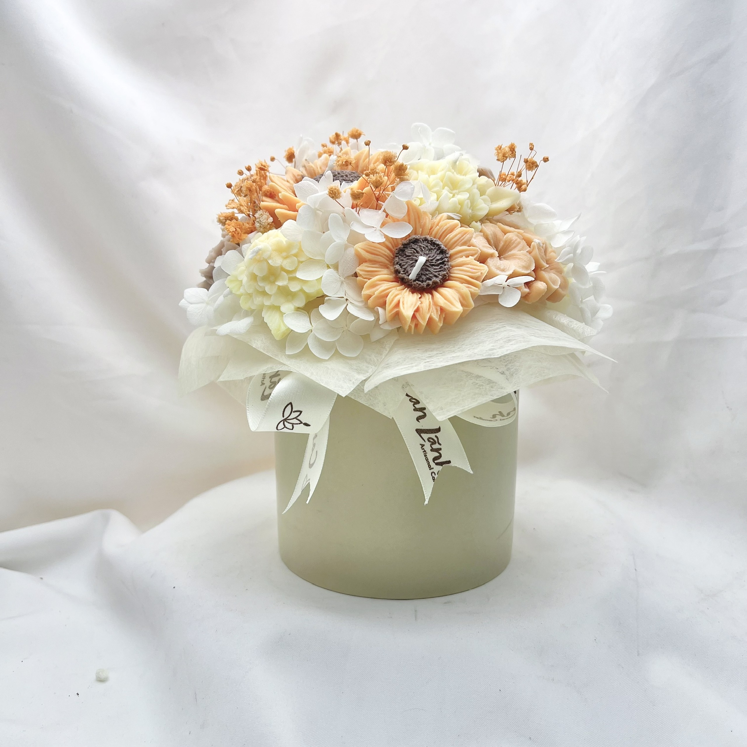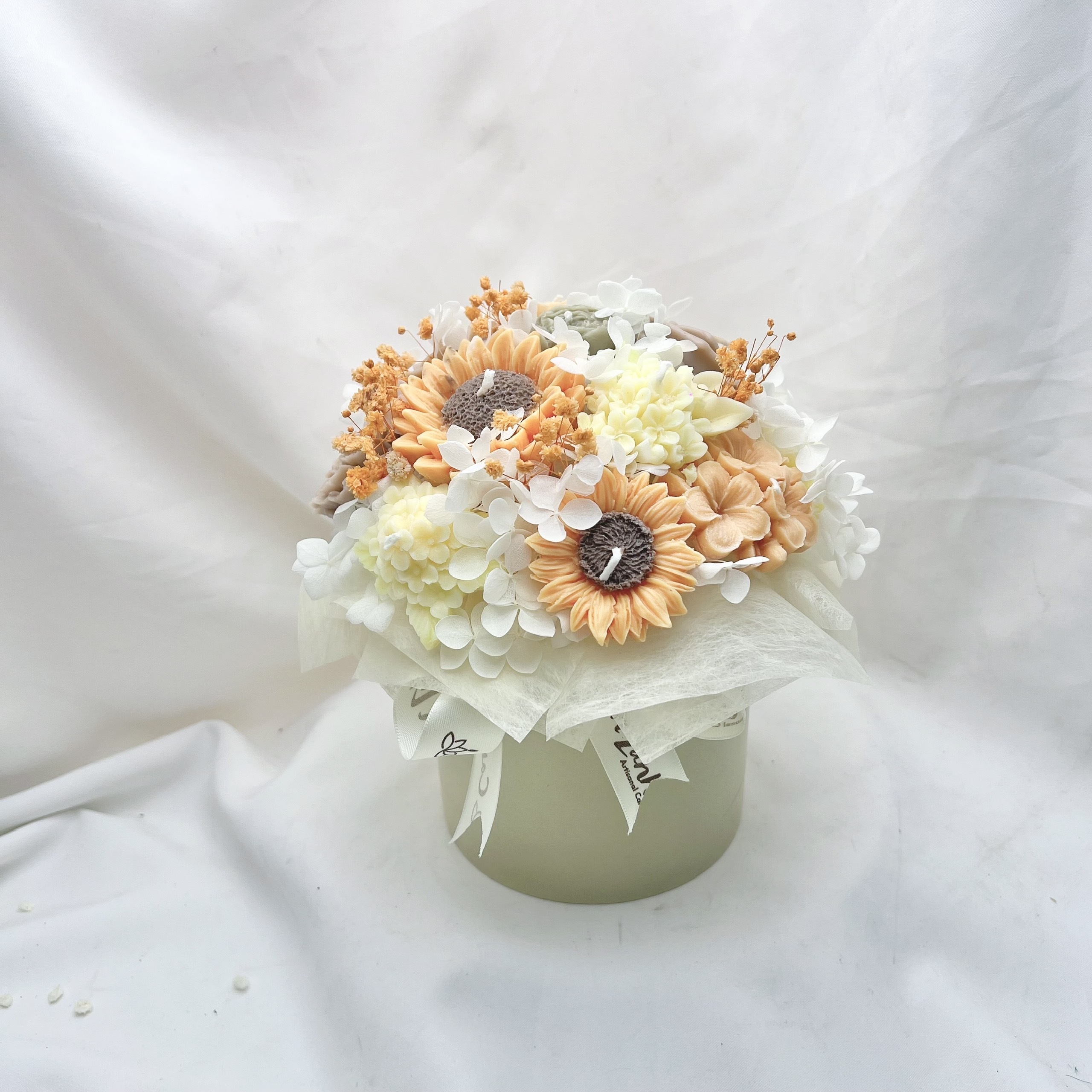 Nếu bạn đang tìm kiếm một chút nắng ấm để làm bừng sáng góc làm việc hay dành tặng người thương một lời chúc rạng rỡ, “Hạ Sang” chính là lựa chọn hoàn hảo nhất. Tác phẩm là sự kết hợp giữa nét kiêu hãnh của hoa Hướng Dương và sự thanh khiết của những đóa cúc nến trắng kem.