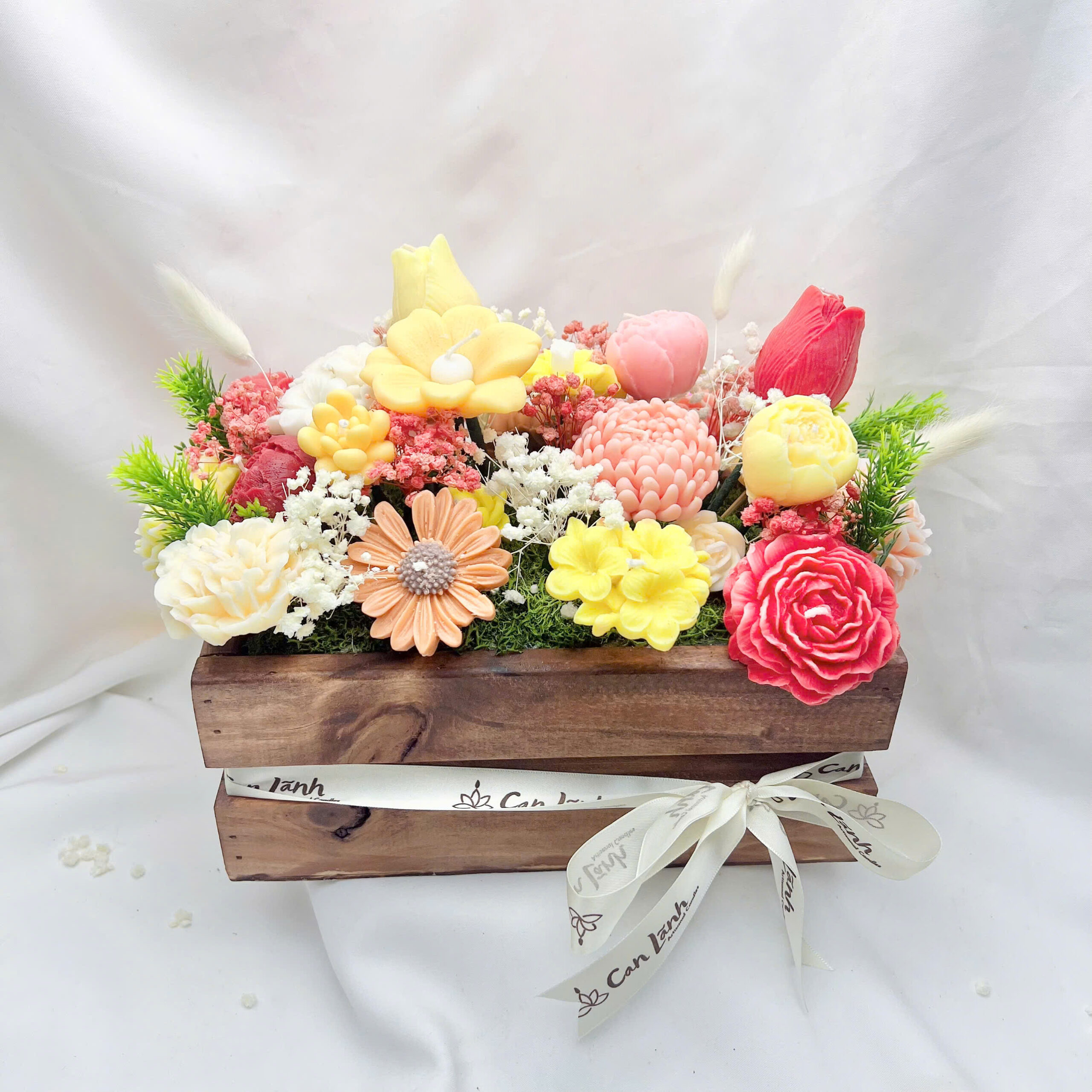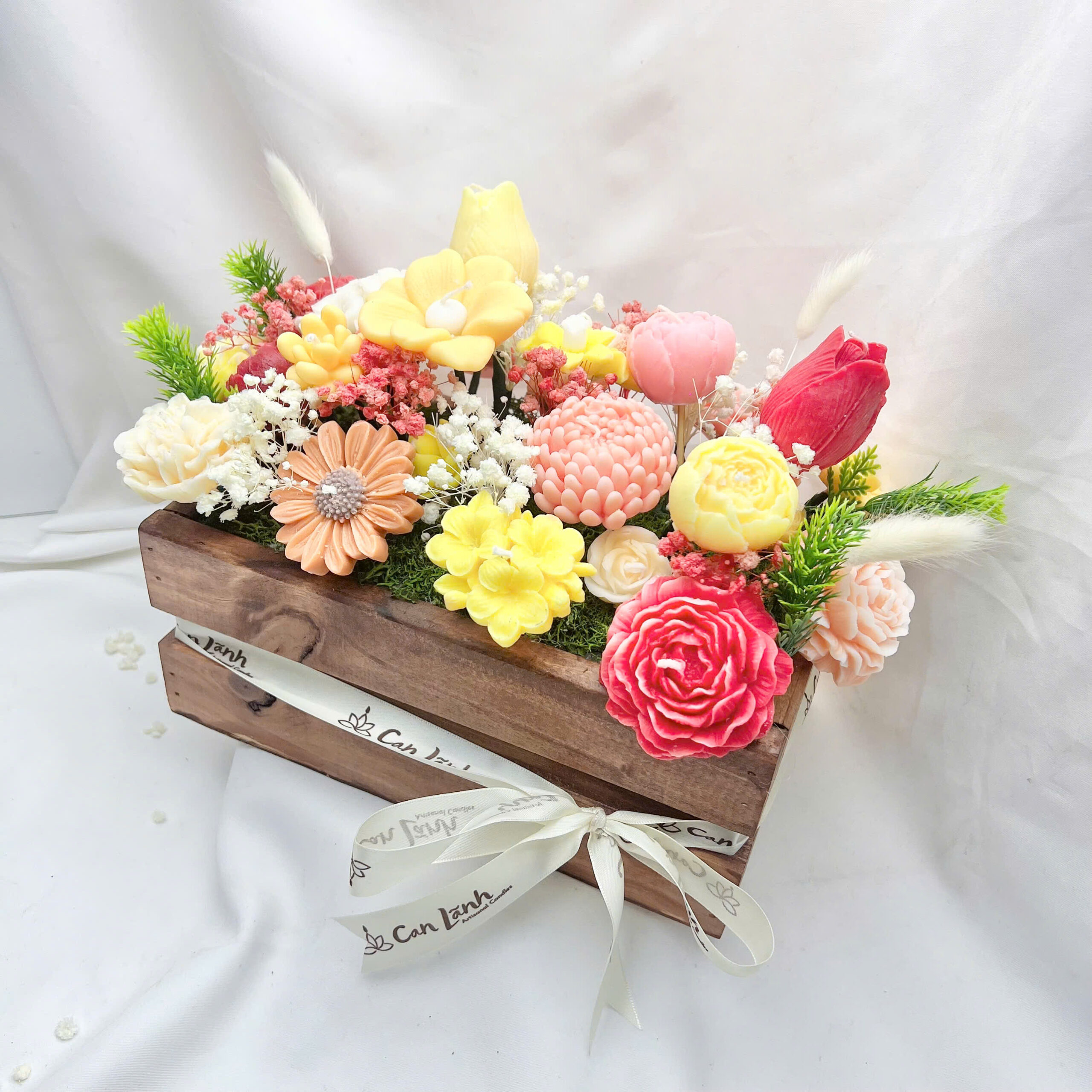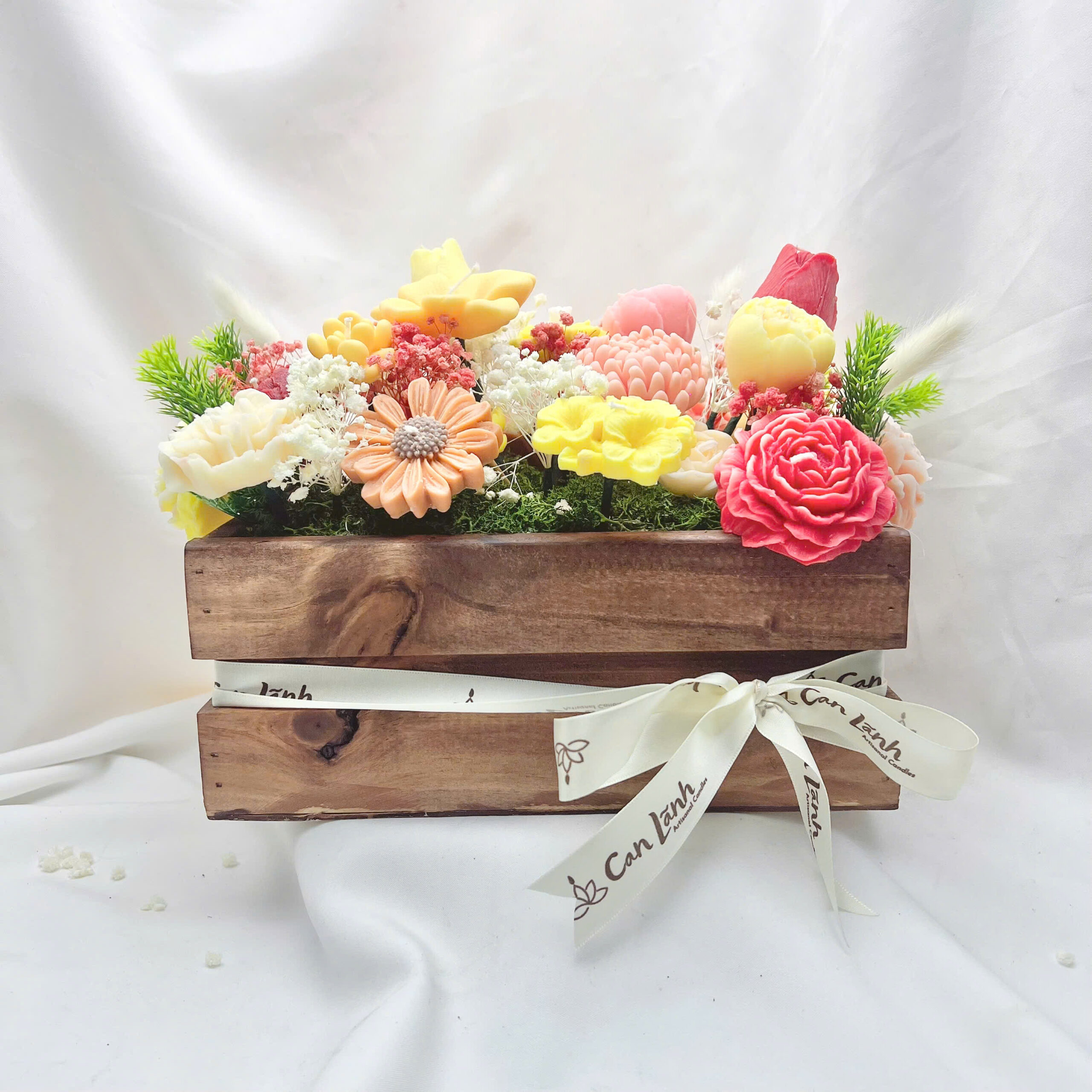 Hộp gỗ hoa nến thơm 30 bông từ Can Lãnh là sự giao thoa tuyệt vời giữa nét thô mộc của gỗ tự nhiên và sự mềm mại, tinh xảo của những đóa hoa nến thủ công. Với thiết kế dáng hộp chữ nhật vững chãi, sản phẩm mang đến vẻ đẹp cổ điển, ấm cúng, phù hợp cho mọi phong cách trang trí nội thất từ hiện đại đến Vintage.