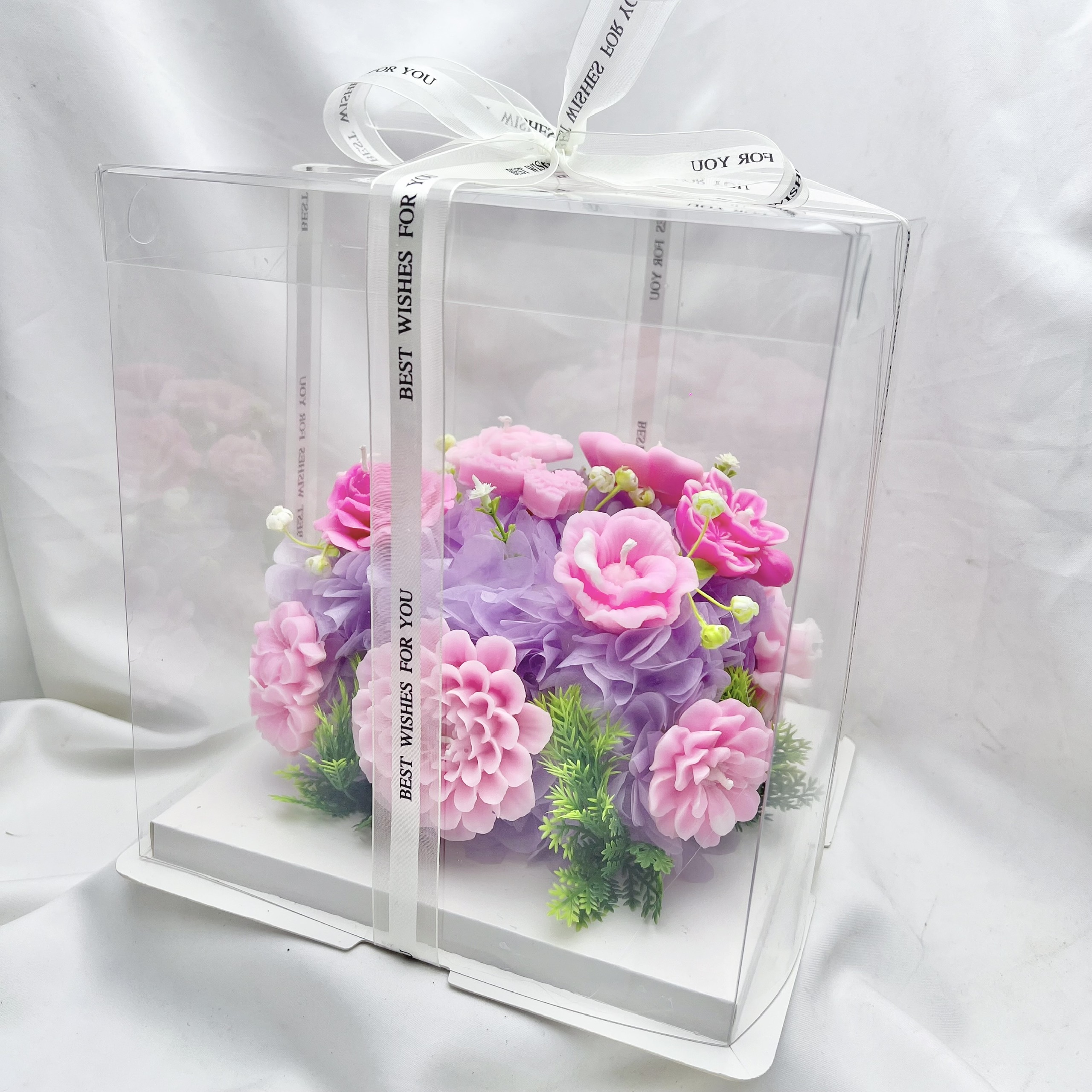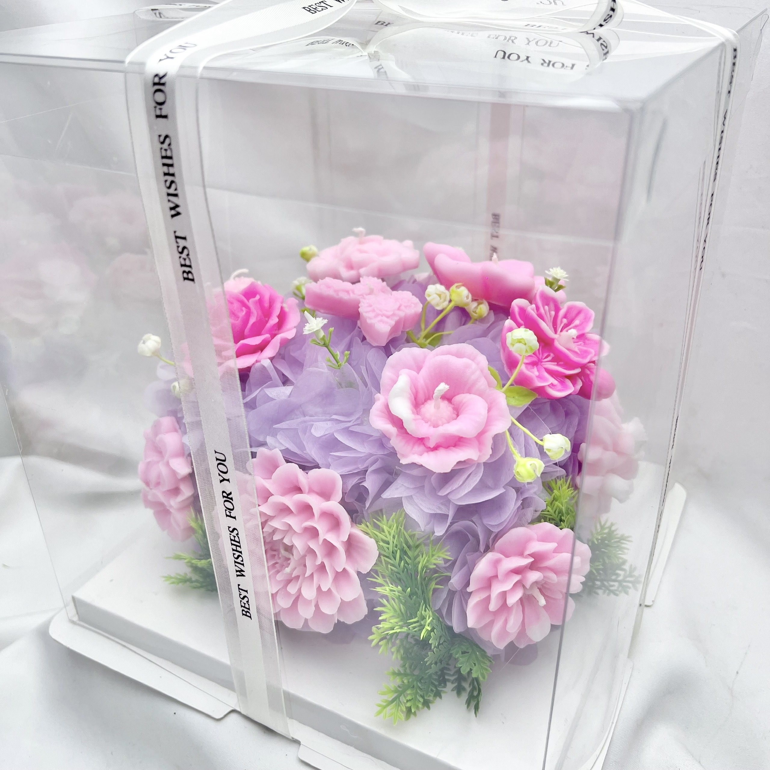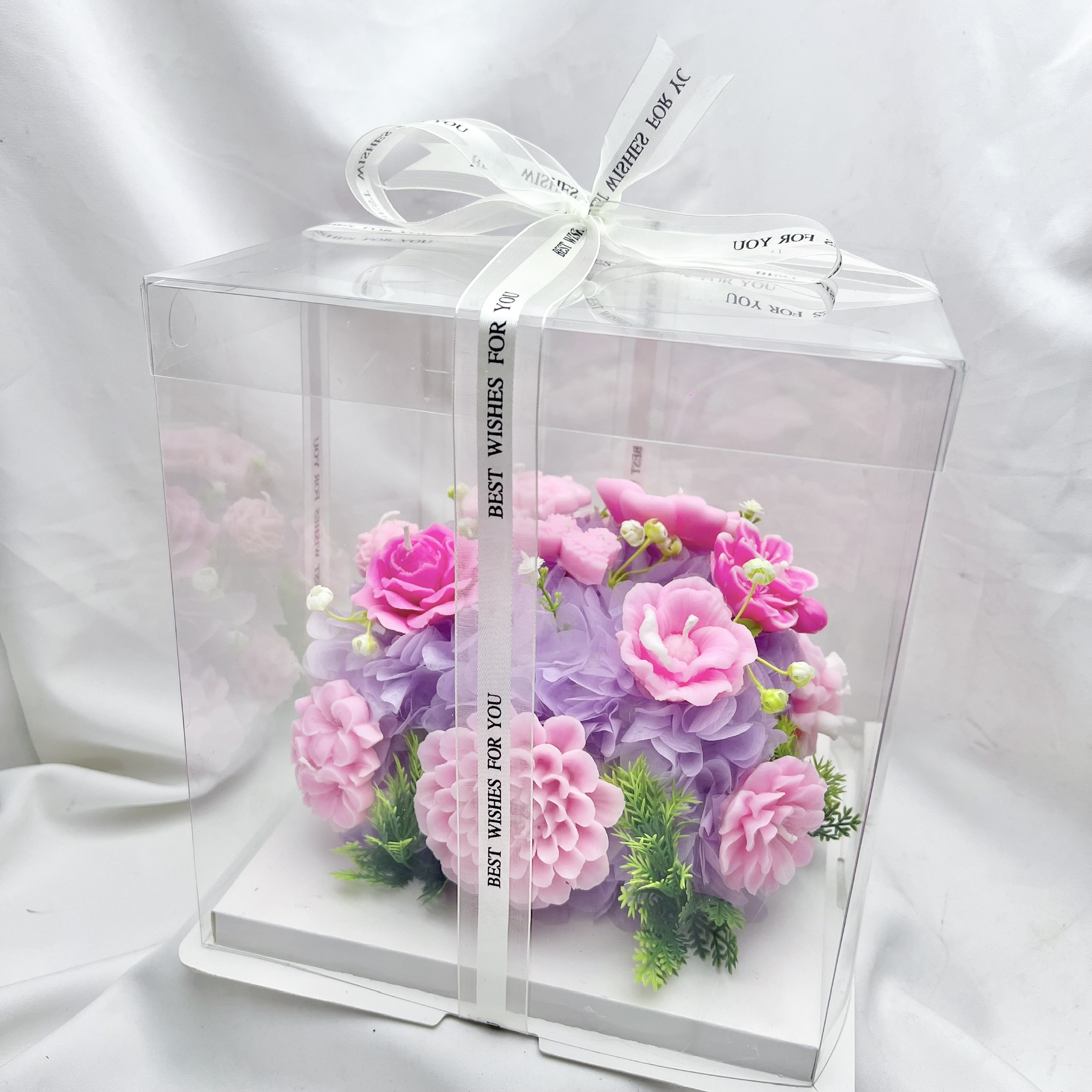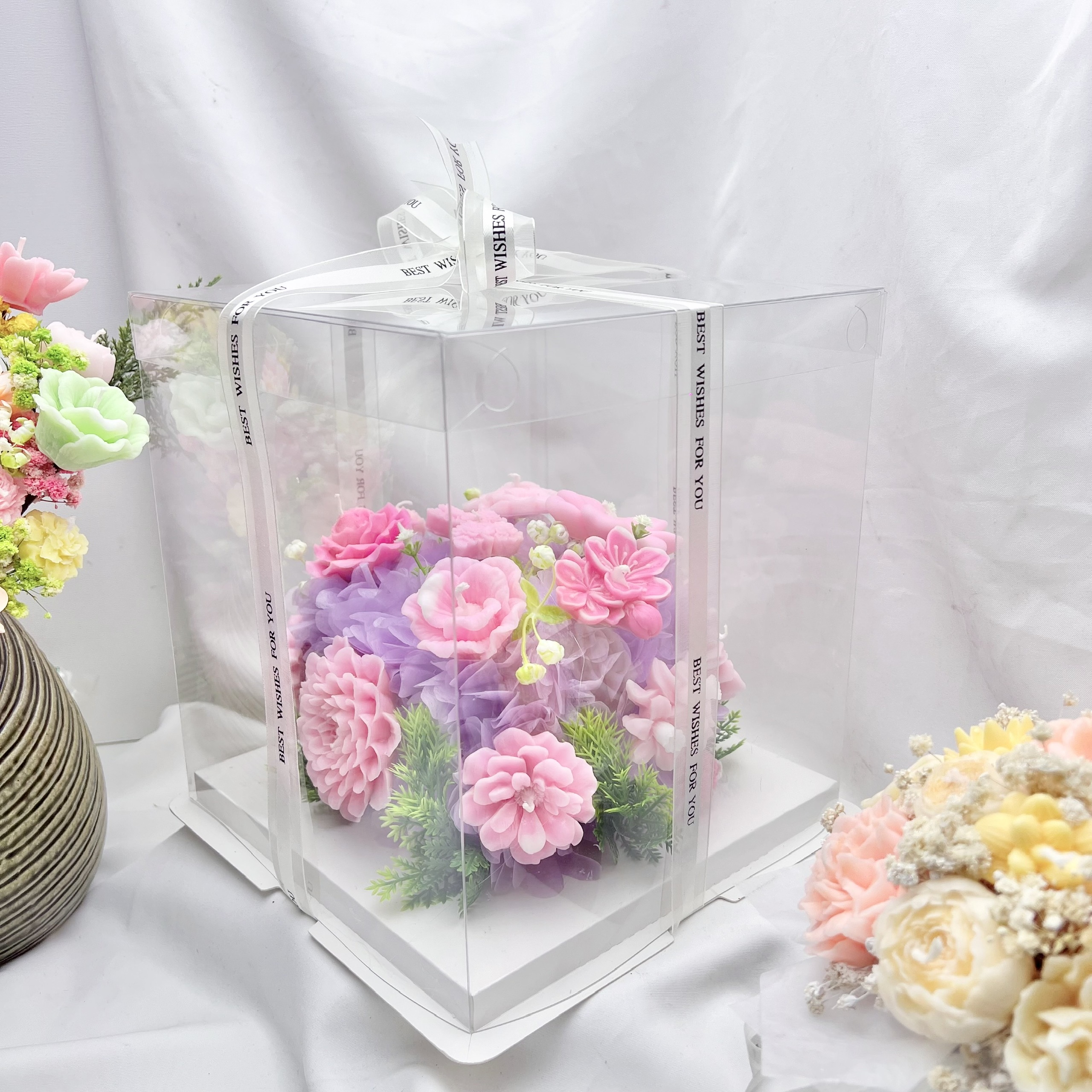 Trình bày sang trọng: Sản phẩm được bảo quản trong hộp mica trong suốt cao cấp, thắt nơ lụa “Best Wishes For You”, giúp bảo vệ hoa nến khỏi bụi bẩn và giữ hương thơm bền lâu.