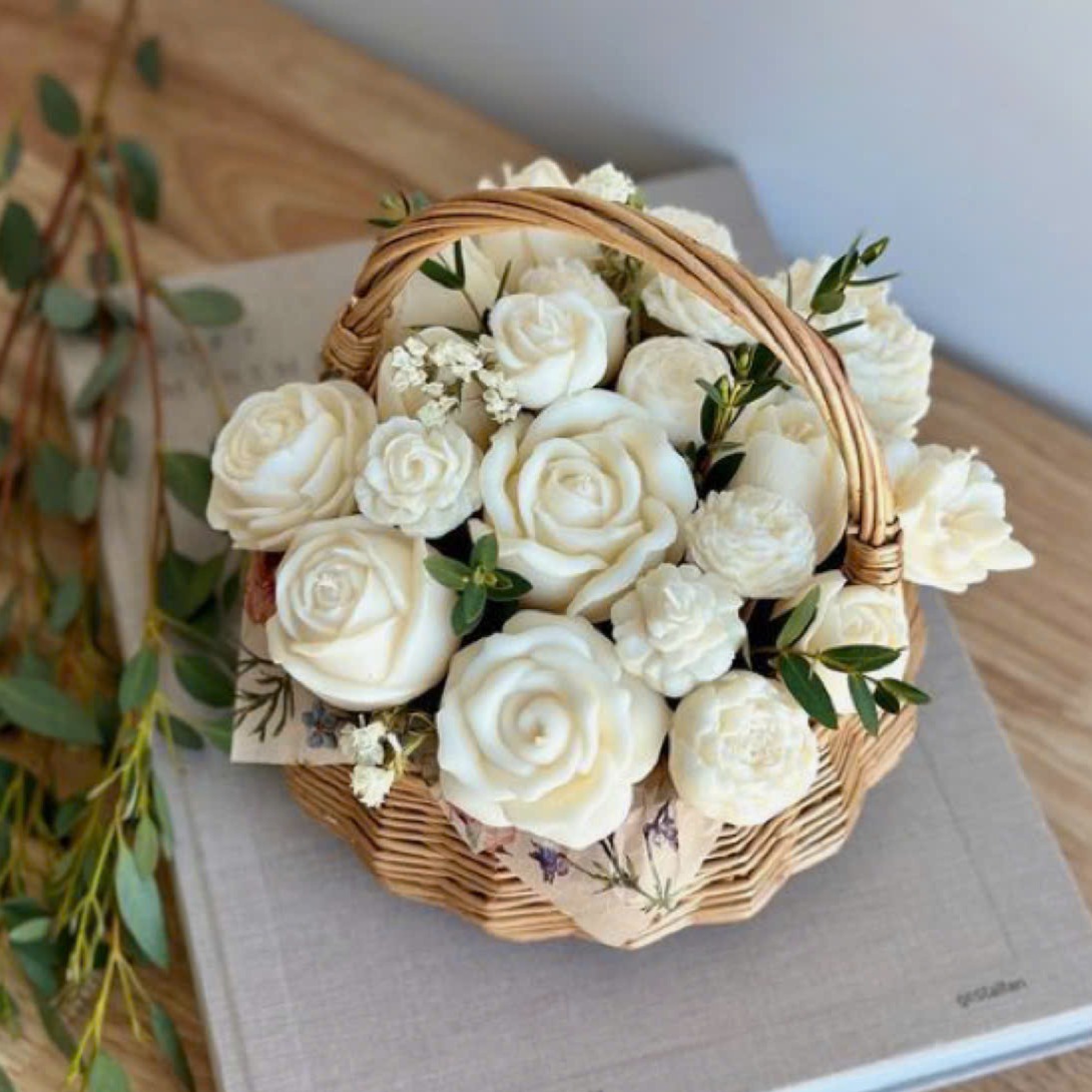 Nến thơm giỏ hoa để bàn 19 bông – Can Lãnh, handmade 100% từ sáp thiên nhiên.