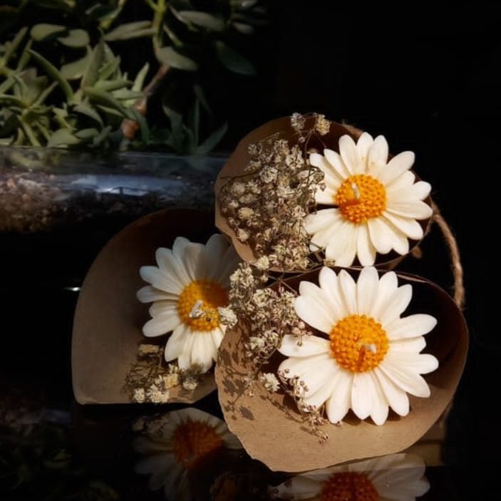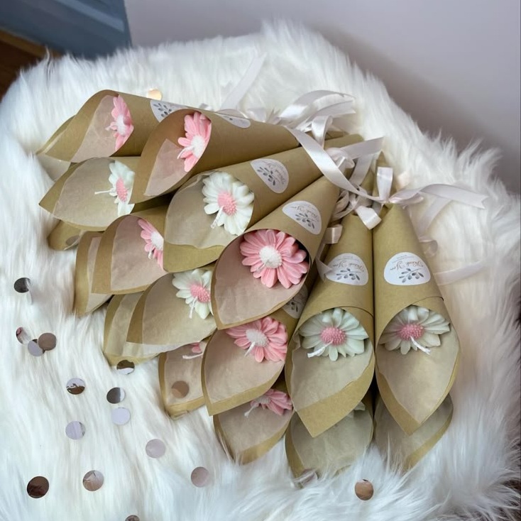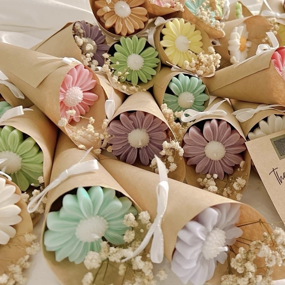 - Thiết Kế Độc Đáo & Tinh Tế: Nến tạo hình hoa cúc được gói trong giấy Kraft hình ốc quế, có thể tùy chỉnh nhãn dán hoặc thẻ tên, tạo dấu ấn riêng cho từng sự kiện.