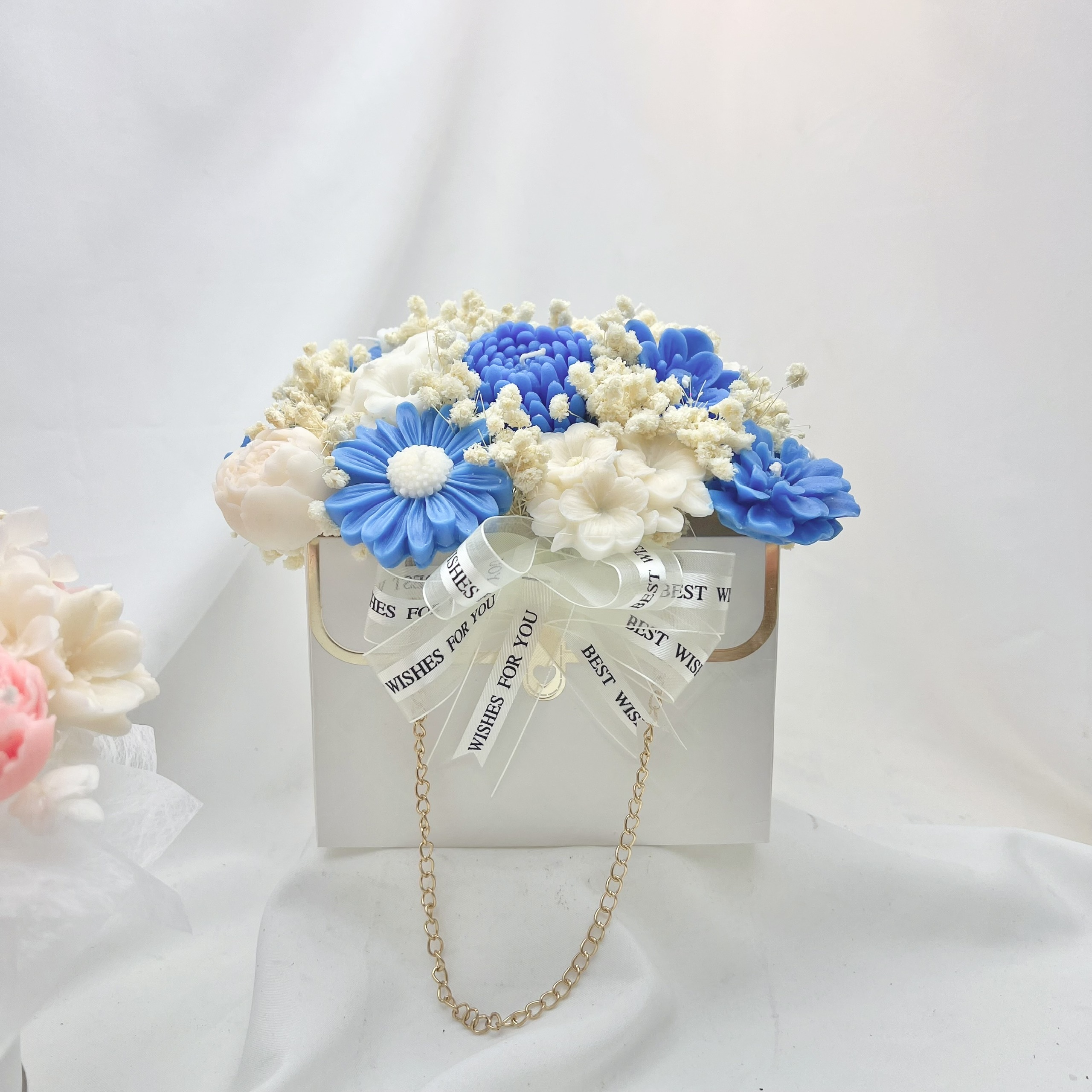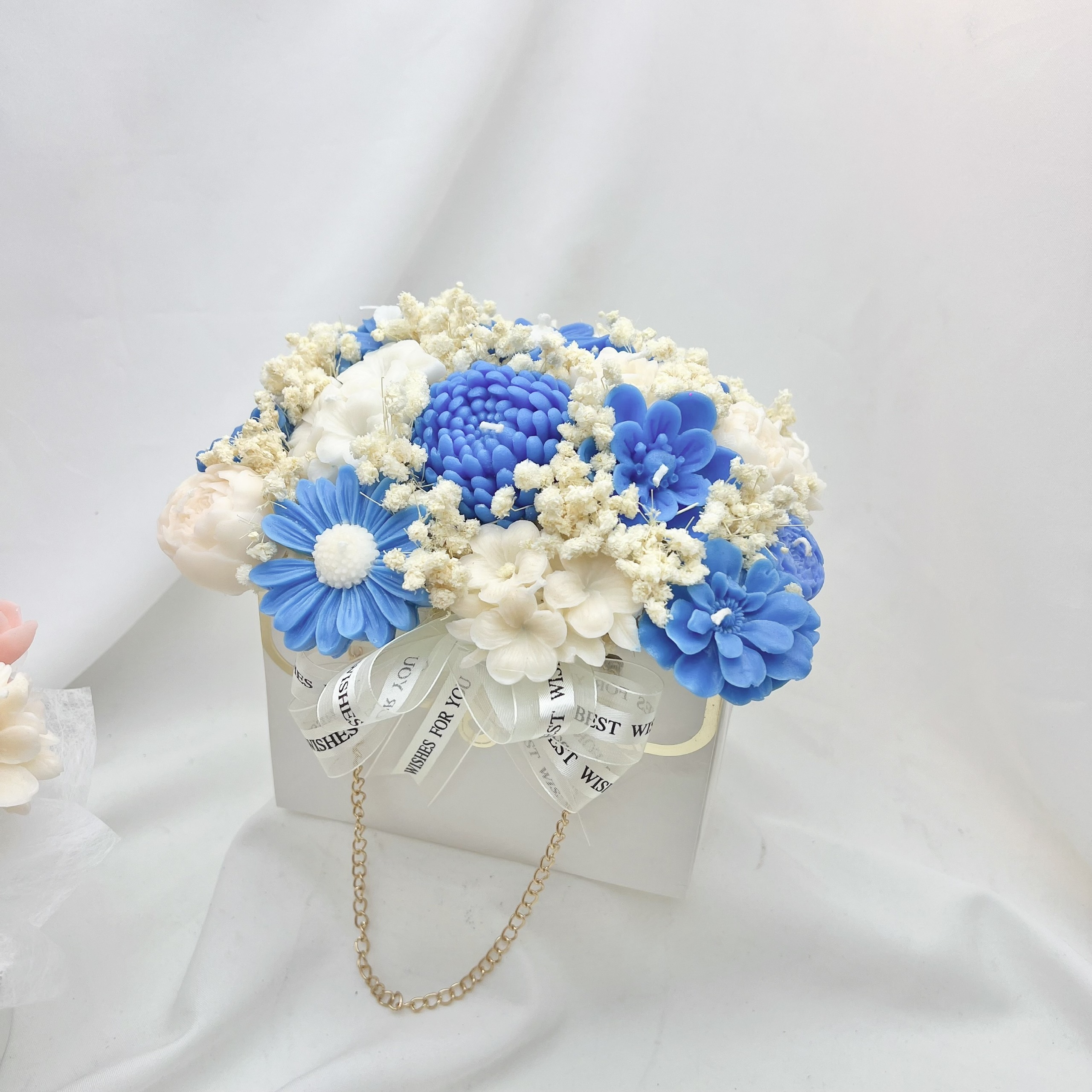 Túi xích hoa nến thơm 20 bông từ thương hiệu Can Lãnh là sự phá cách đầy sáng tạo trong nghệ thuật quà tặng. Thay vì những dáng giỏ truyền thống, sản phẩm được trình bày trong một chiếc túi hộp trắng sang trọng với dây xích vàng tinh tế, tạo nên vẻ ngoài như một món phụ kiện thời trang cao cấp.