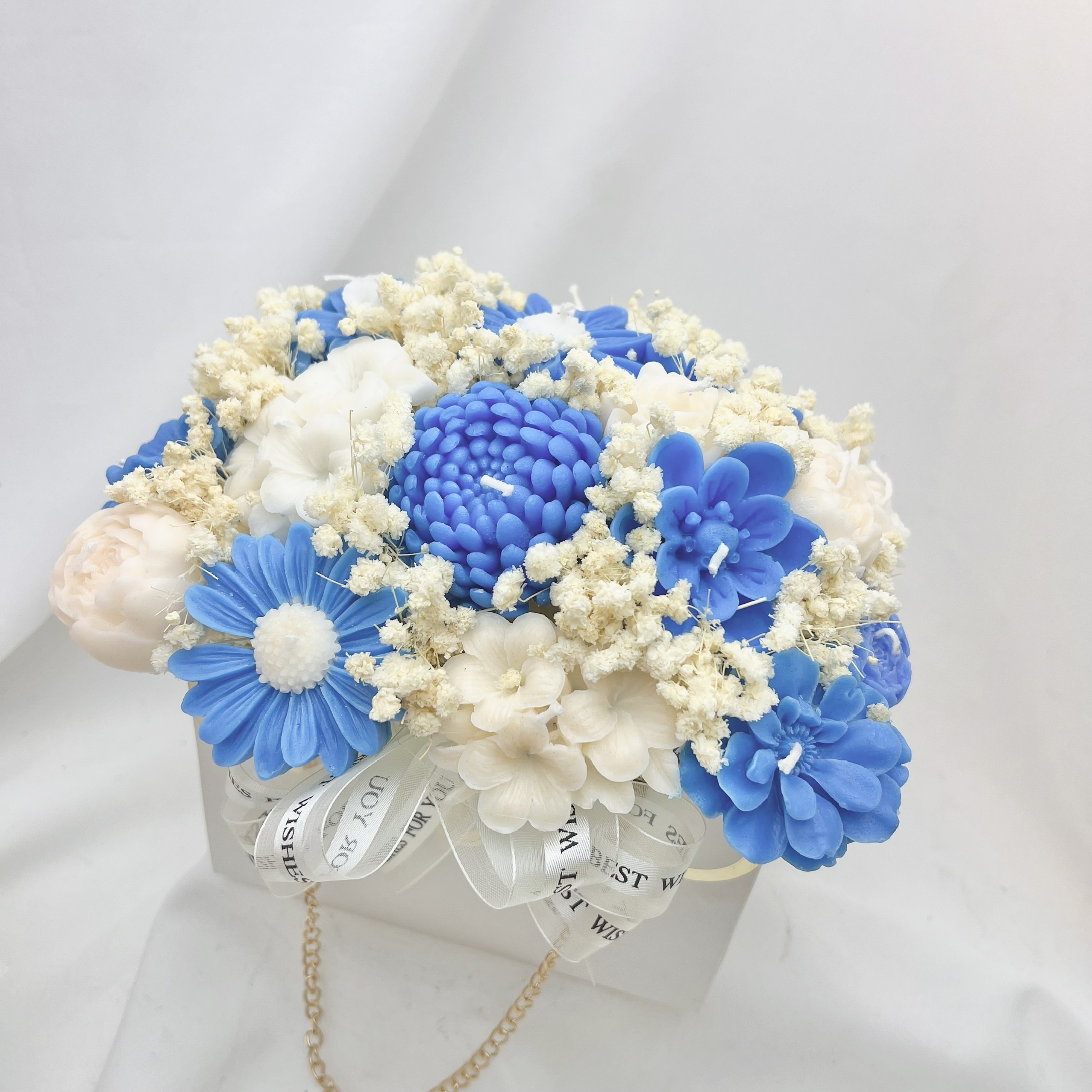 Chế tác thủ công: 20 đóa hoa nến (hoa cúc, mẫu đơn, hoa trà) được đúc từ sáp đậu nành và sáp ong tự nhiên, giữ trọn độ sắc nét và sống động trong từng cánh hoa.