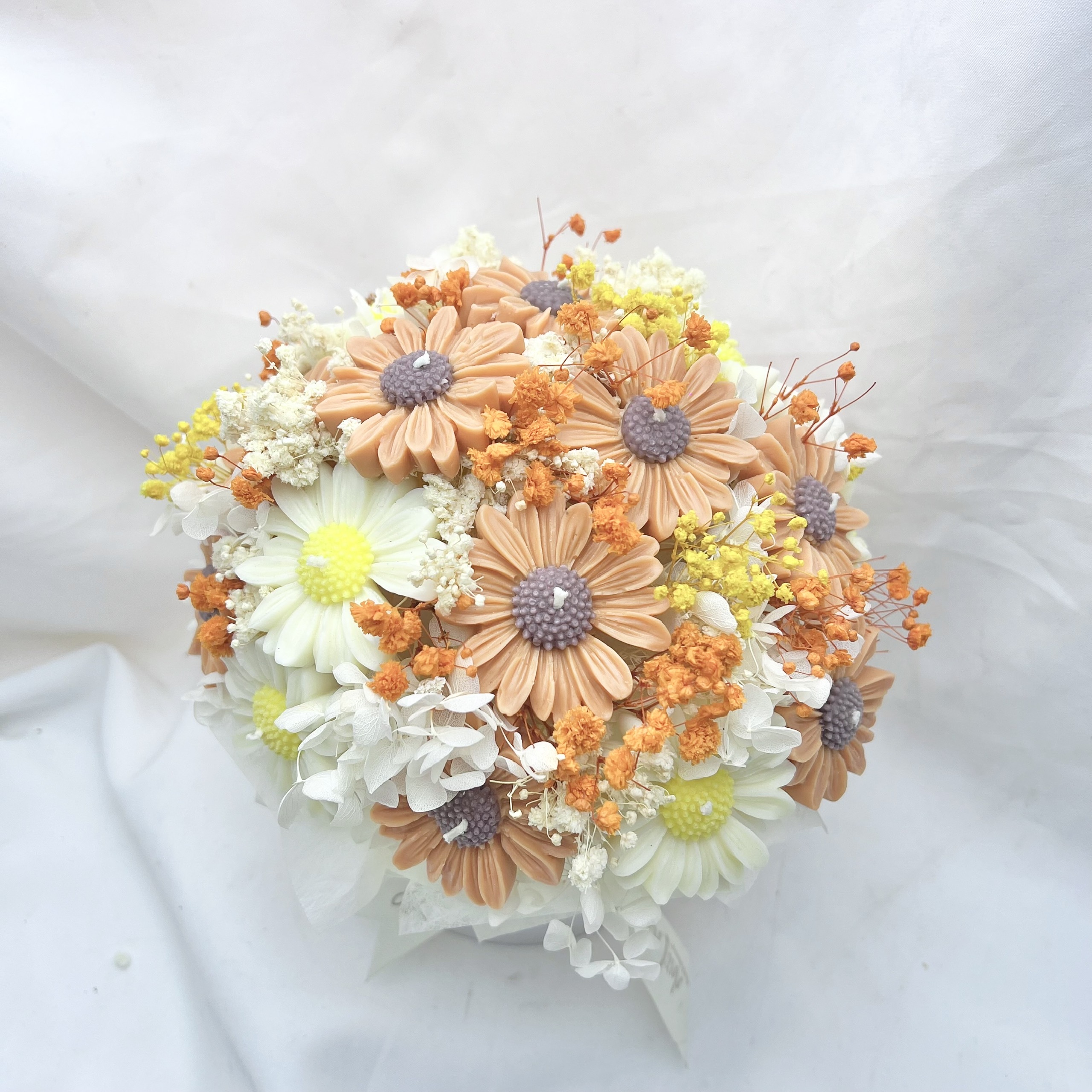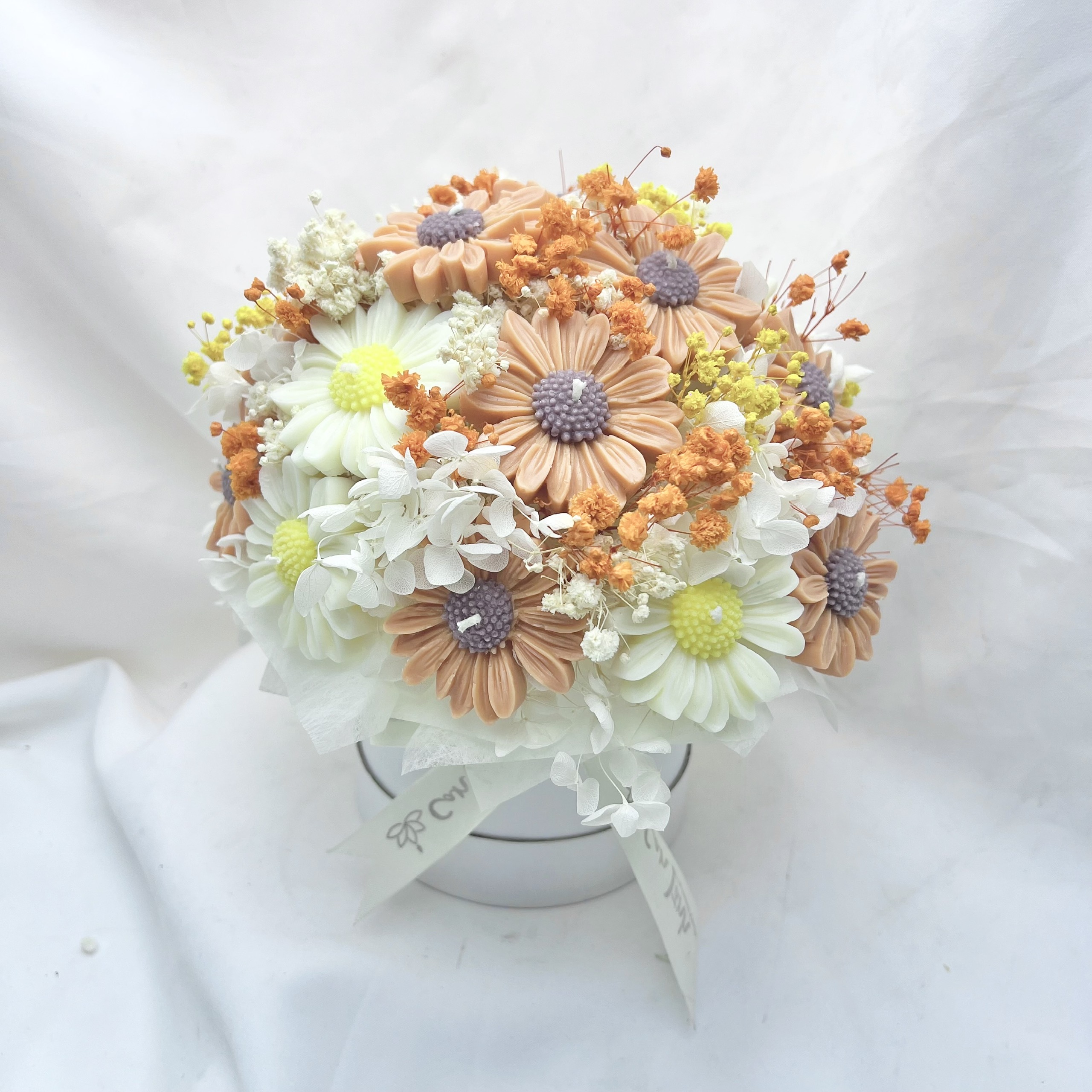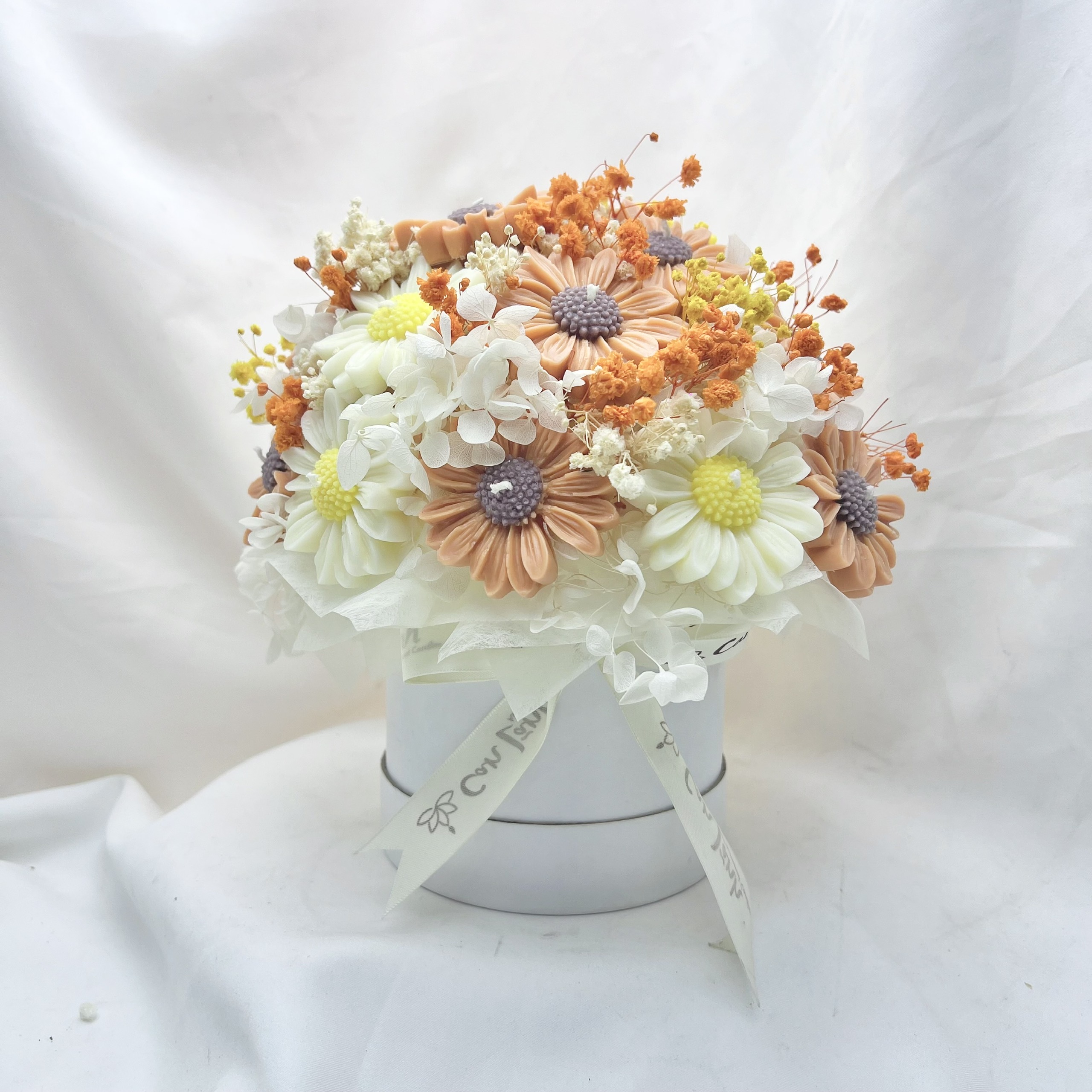 Sắc màu của sự chân thành: 20 đóa hoa nến (chủ đạo là hoa Cúc Họa Mi và hướng dương nghệ thuật) được phối trộn tinh tế giữa sắc trắng tinh khôi, vàng nắng và cam đất ấm áp. Một bảng màu mang lại cảm giác gần gũi, thân thuộc và tràn đầy hy vọng.